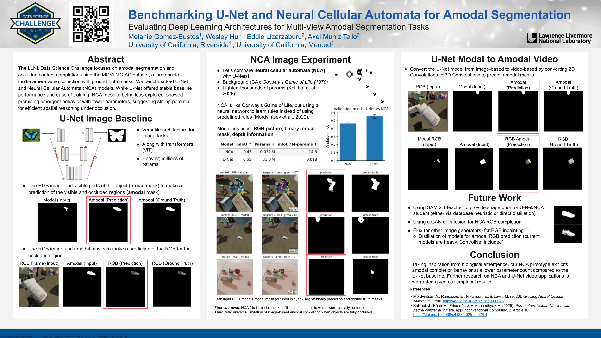 I presented our findings to management, outlining potential optimizations swapping the Unet model for a Neural Cellular Automata model that could reduce model parameters by nine hundred percent. These improvements have the potential to enhance the accuracy and efficiency of object recognition in LLNL’s fully autonomous lab equipment.