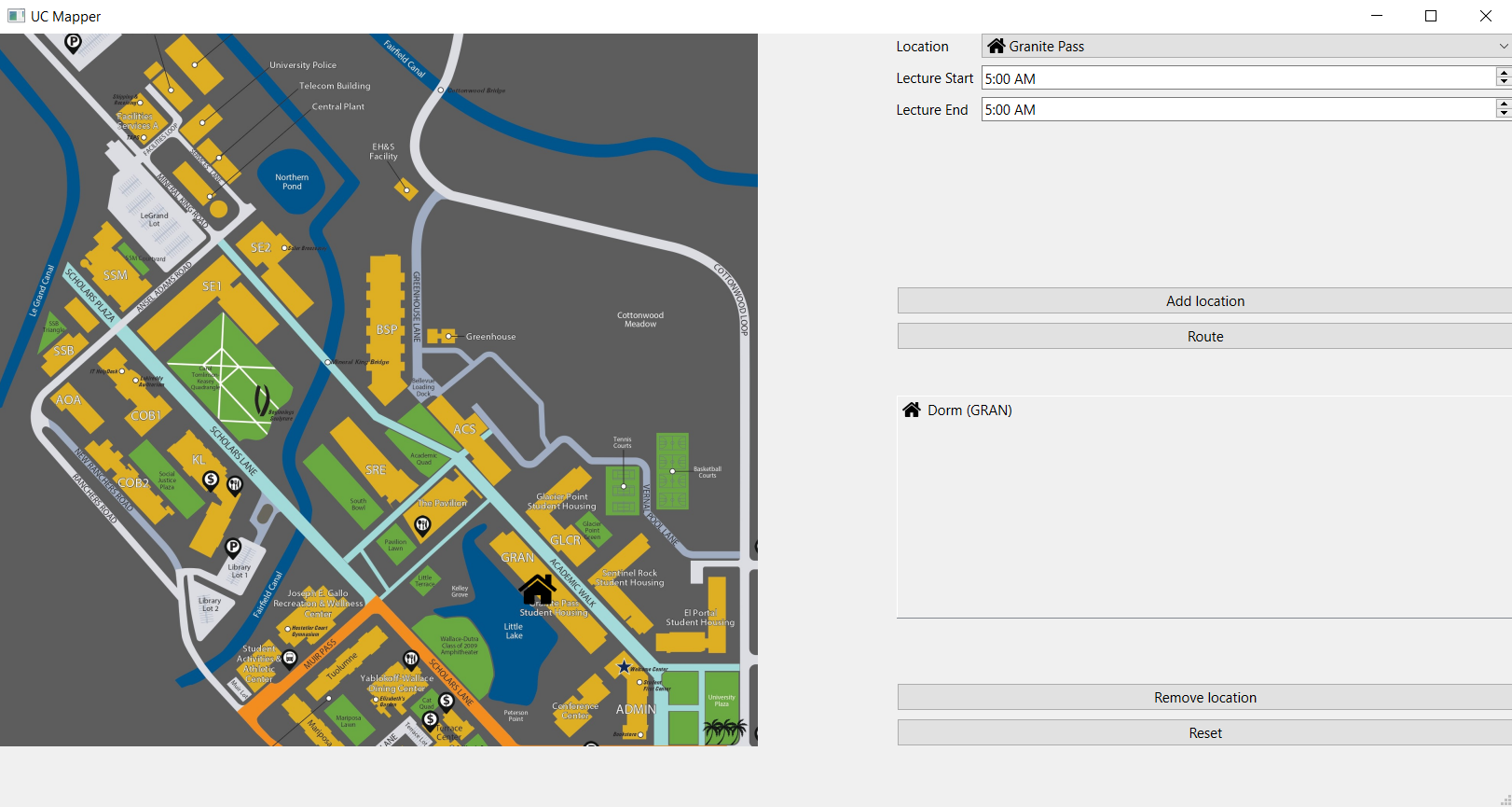 UC Mapper: A Qt project that allows UC Merced Students to set up a schedule and determine an optimal path to their classes and extracurricular activities.