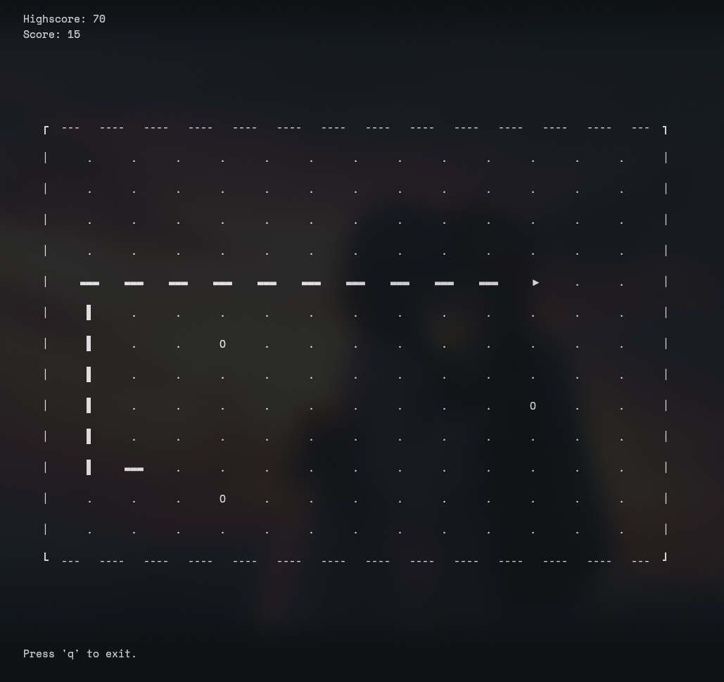I programmed all the game logic, controls and rendering myself making use of the crossterm crate to display the game on the terminal. I worked hard to make sure the game felt smooth and ran at a consistent speed.